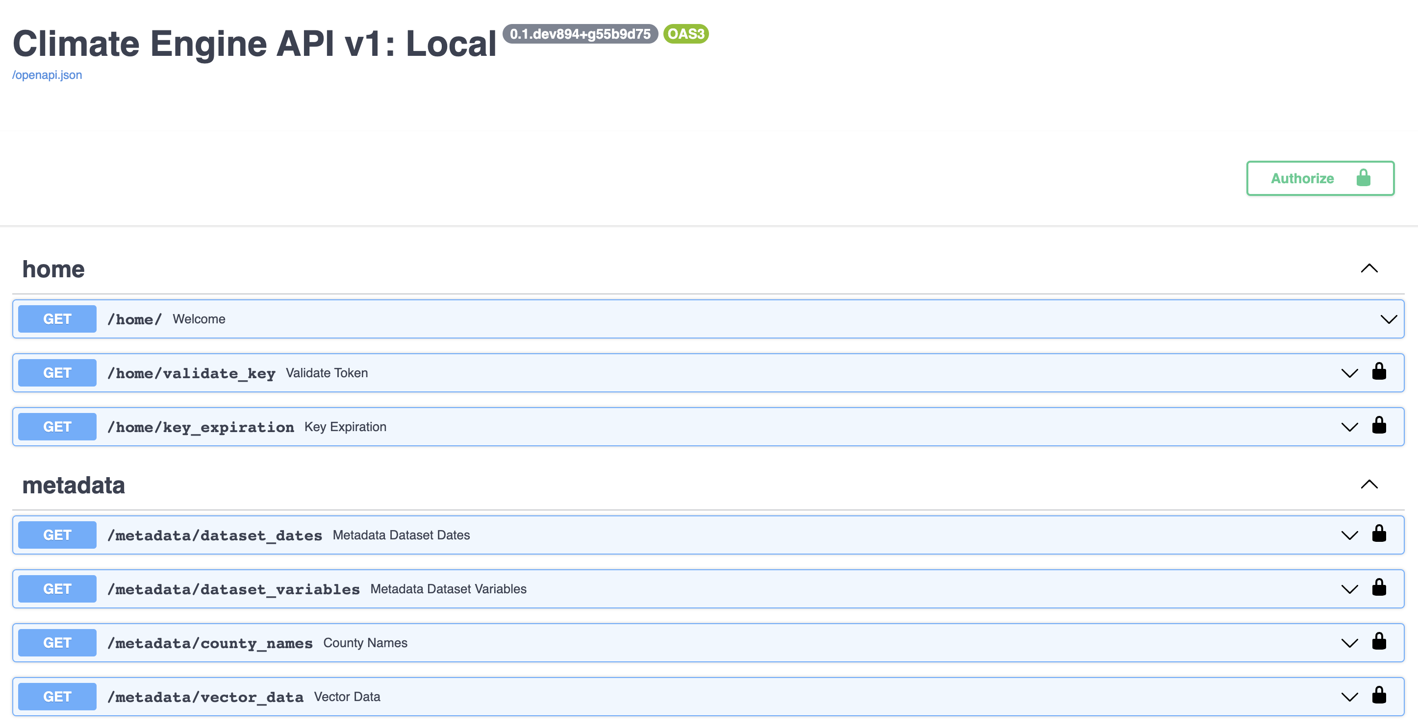 To try out an endpoint, scroll to the endpoint of interest. Click the downward facing arrow on the right side of the endpoint to expand the endpoint box. Then click the button labeled Try it out. This allows you to edit the parameters boxes and execute a request. Each endpoint has a different set of parameters it requires, and more details on the different endpoint parameter requirements and options can be found under the Endpoint Parameters section of the Climate Engine API tab of this site.