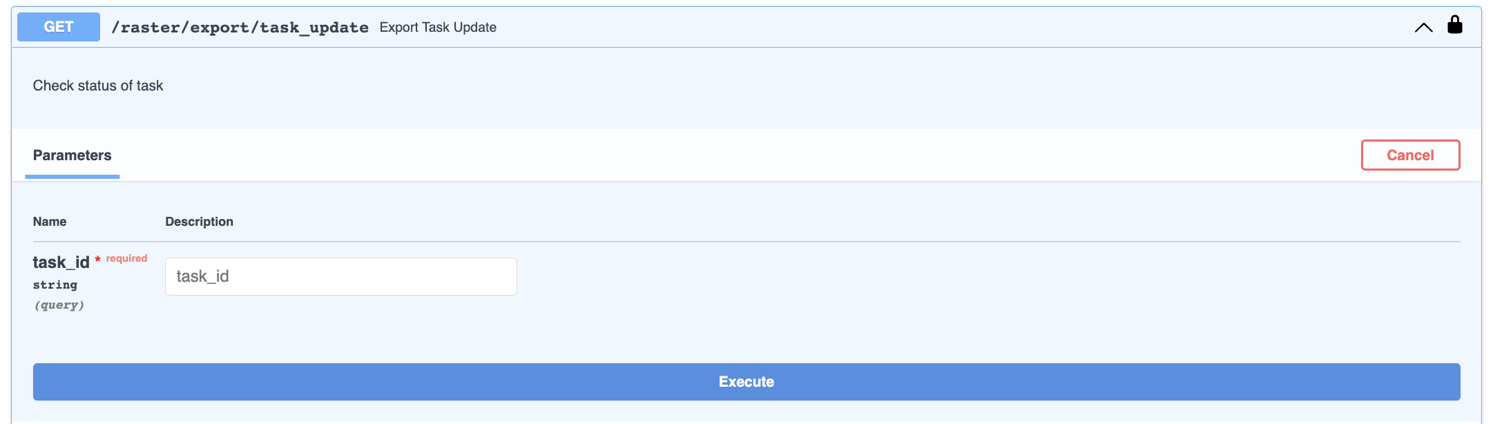 Once you click the execute button, you get multiple outputs. The curl and request URL show the request you made. The response body outline the task generated from the parameters you submitted. You can see that the state of the task starts as ready. As the task is completed, the state is updated to COMPLETE. You can check the state using the /export/task_update endpoint and the task id (which is right above name is the response body).