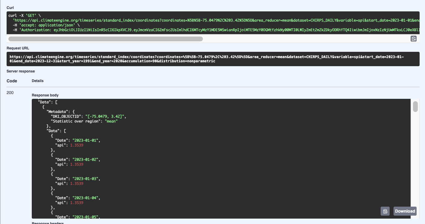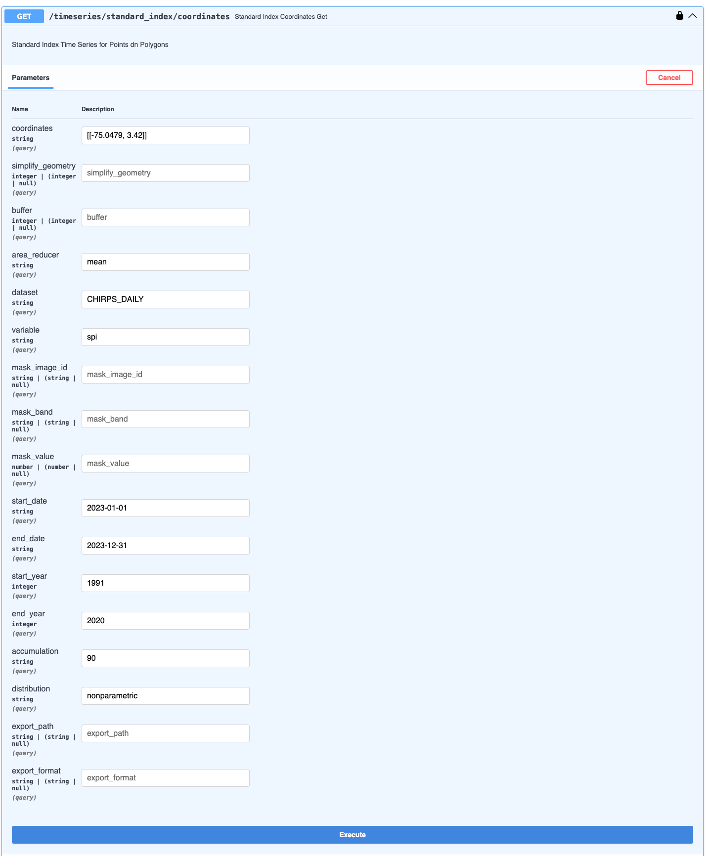- Navigate to the timeseries/standard_index endpoints. For this example, we will use timeseries/standard_index/coordinates and a random point.