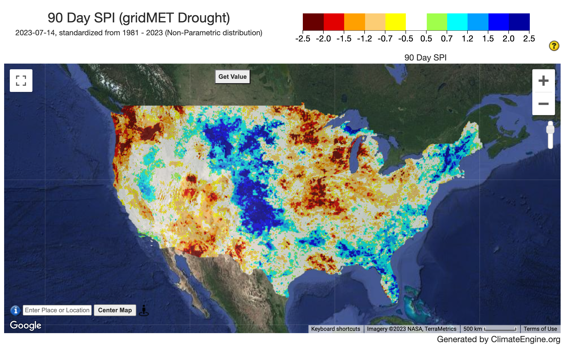 Example map of Standardized Precipitation Index (SPI) for July 14, 2023 from GridMET climate reanalysis dataset.