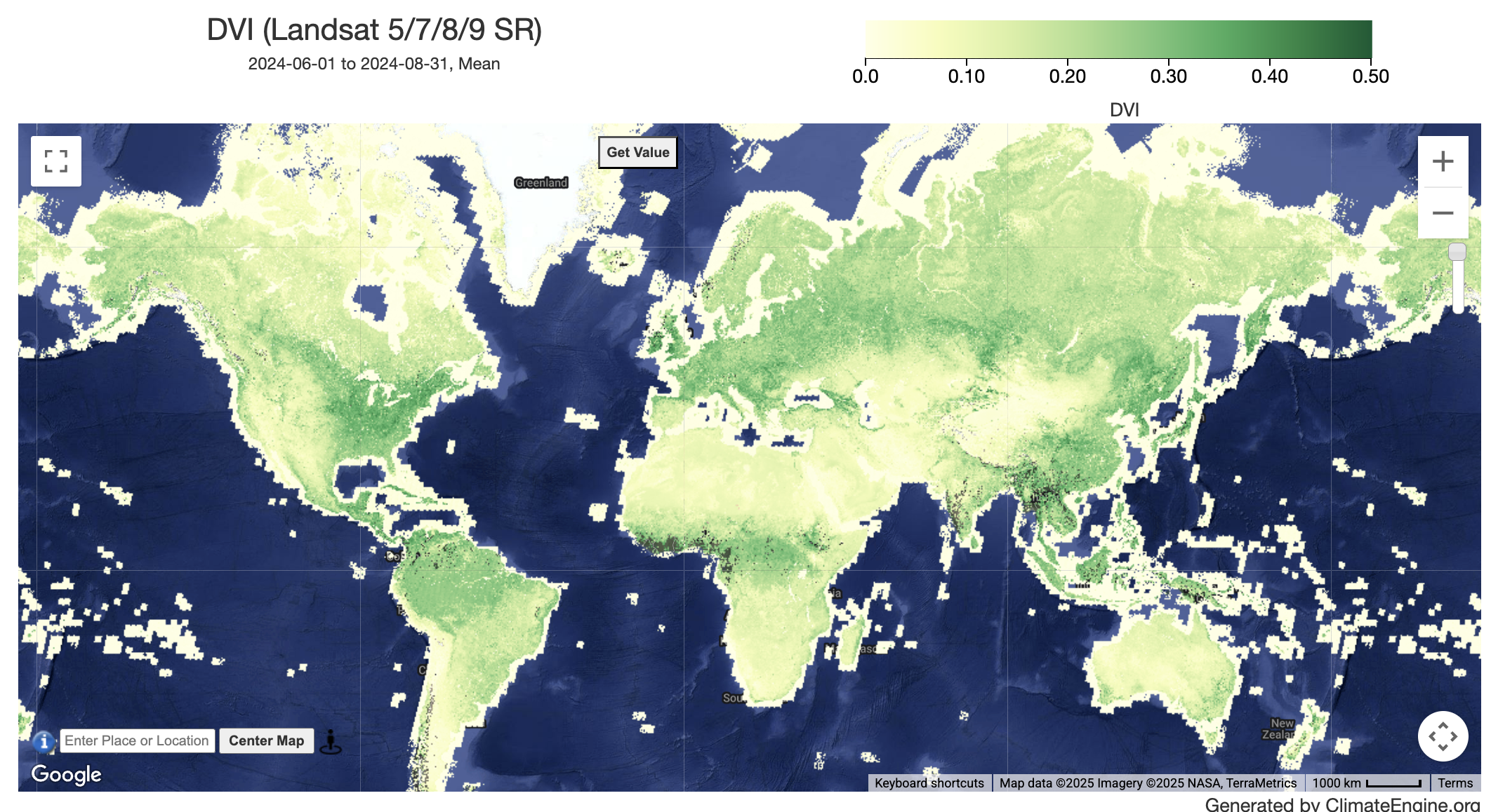 The Difference Vegetation Index (DVI) is a simple vegetation index used to assess vegetation presence and density by calculating the difference between the reflectance values of the near-infrared (NIR) and red spectral bands. Since healthy vegetation strongly reflects NIR light while absorbing red light, higher DVI values indicate denser or healthier vegetation, while lower values suggest sparse or stressed vegetation.