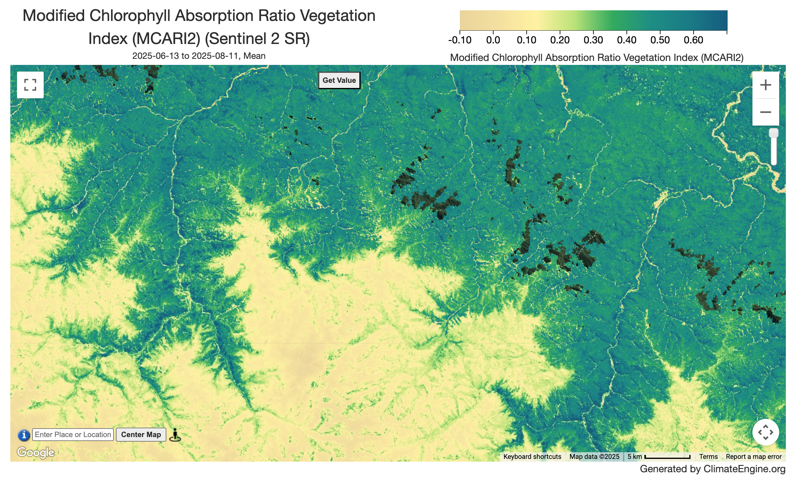 The Modified Chlorophyll Absorption Ratio Index 2 (MCARI2) was developed to improve the estimation of green vegetation properties such as leaf area index (LAI) and canopy chlorophyll content. Vegetation reflects and absorbs light differently depending on leaf pigments and canopy structure. Chlorophyll pigments strongly absorb red light (from 0.6 to 0.7 µm) for photosynthesis, while the cell structure of leaves strongly reflects near-infrared (NIR) light (from 0.7 to 1.1 µm). Green light (around 0.55 µm) is less absorbed by chlorophyll and provides additional sensitivity to vegetation vigor.