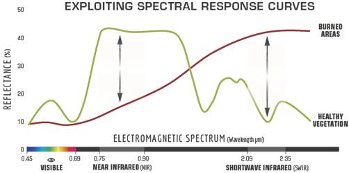 The image below compares a typical spectral signature for healthy/productive vegetation and burned areas.
