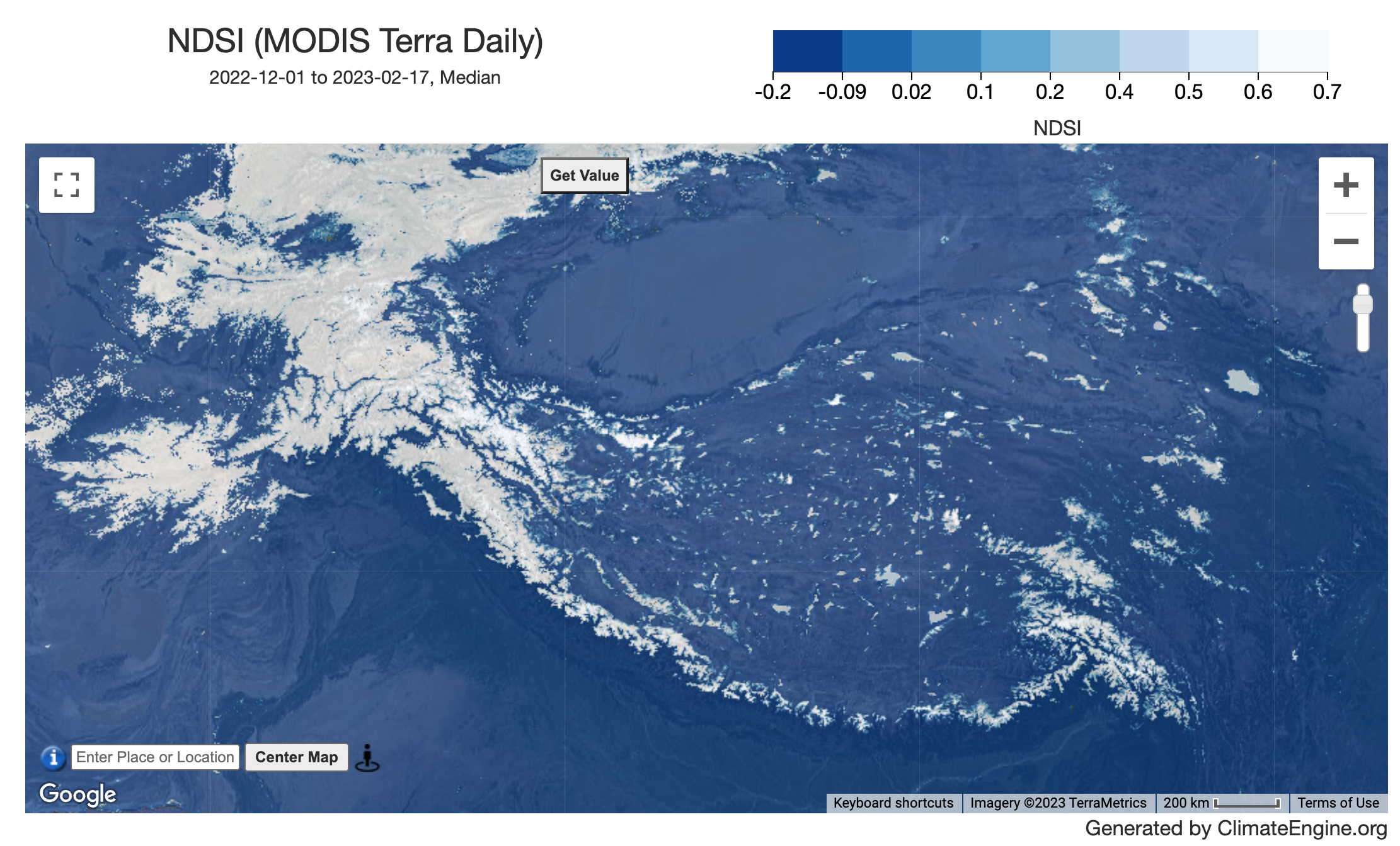 Example map of median MODIS Terra Normalized Difference Snow Index (NDSI) in the Himalaya region during December-February of 2022/2023