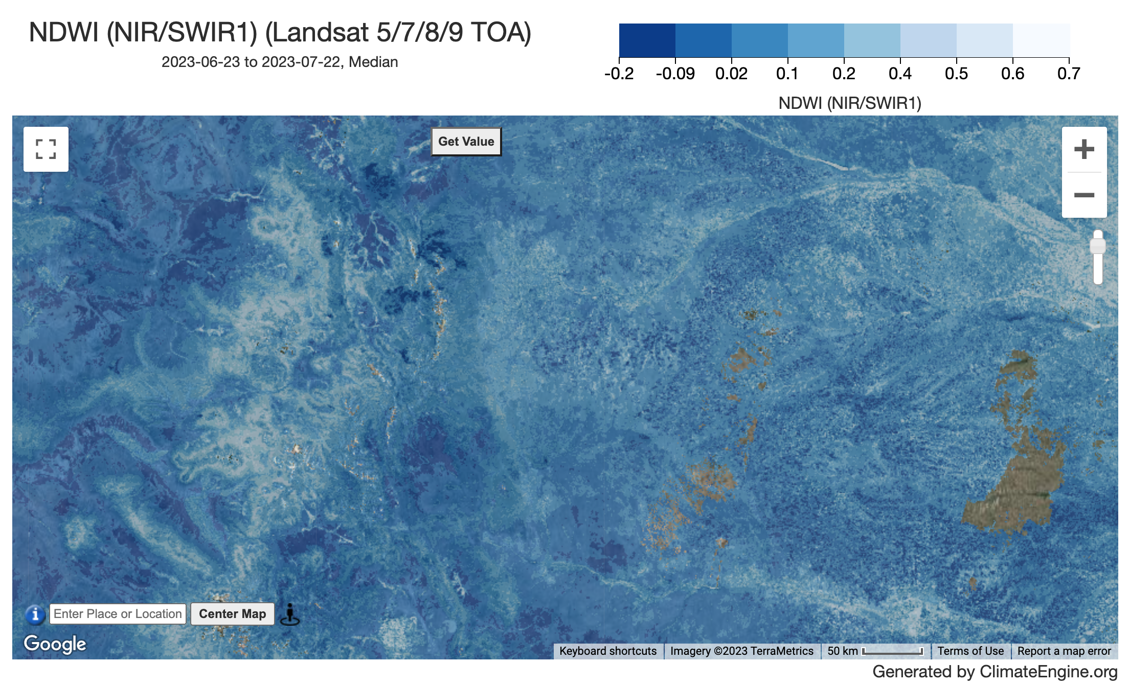 Climate Engine provides a couple different versions of NDWI, utilizing normalized differences of different bands, which can be more useful for different applications: