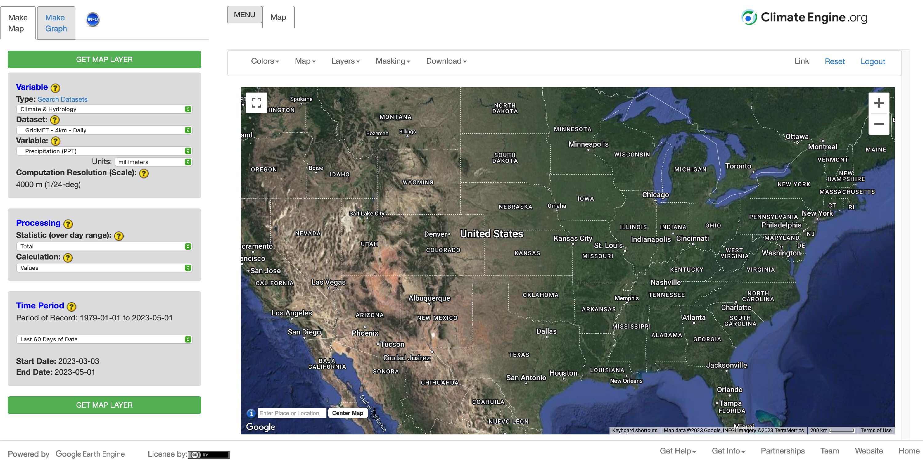 Climate Engine features on-demand mapping of environmental monitoring datasets, such as remote sensing and gridded meteorological observations. With fully customizable analyses, Climate Engine enables the user to produce maps and time series summaries from these datasets. Maps are downloadable in GeoTiff format and time series results as .CSV or .XLSX formats. Web URL links are provided for the results so that users can share maps or time series results and easily reproduce the results.