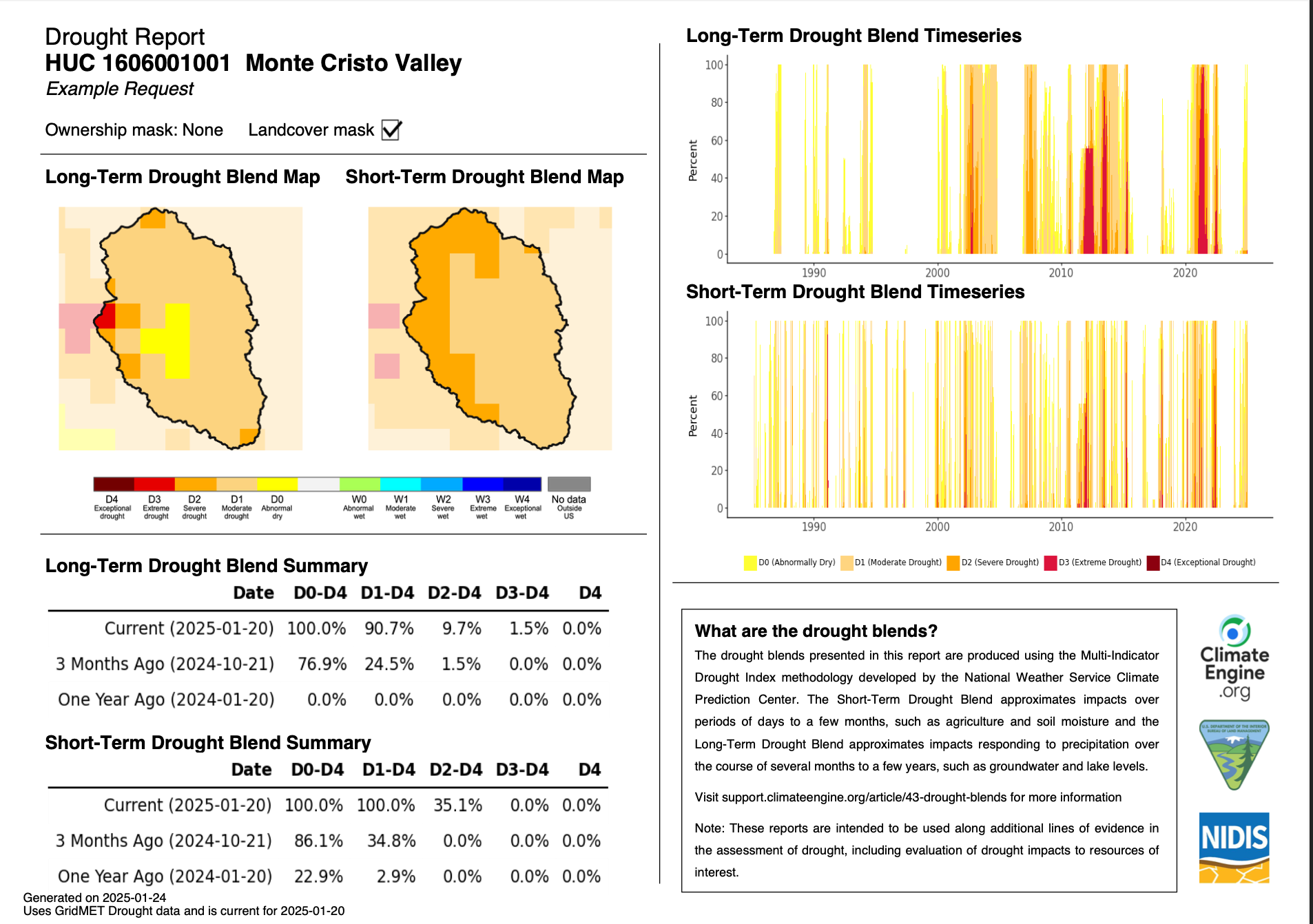 The Climate Engine team has published a new tool to allow resource managers, analysts, and other users to produce drought reports for any location in the lower 48 states. You can find the new Climate Engine reporting tool at reports.climateengine.org. Using the dropdown menus for Drought and select “Generate report.” The reports utilize gridMET drought multi-scalar indices to provide spatial and temporal drought insights.