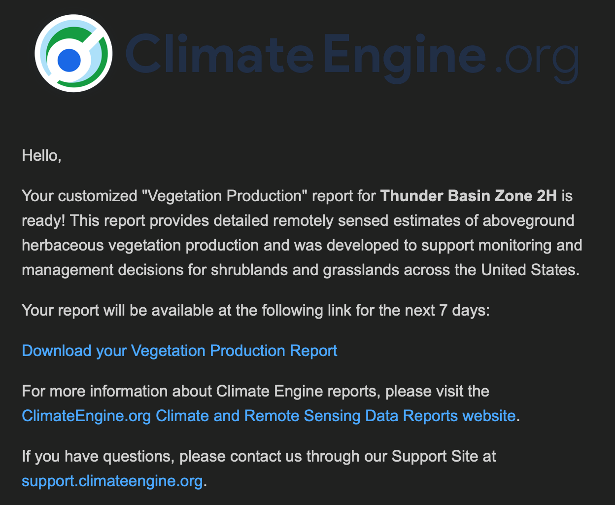 The email will come from no-reply@climateengine.org and the subject line will reference the 'Site name' you provided. For this example, the subject line is 'Your Vegetation Production Report for Thunder Basin Zone 2H is Ready!'. All you have to do to access your report is click 'Download your Vegetation Production Report' and a folder containing the underlying data, the images, and reports will be downloaded.