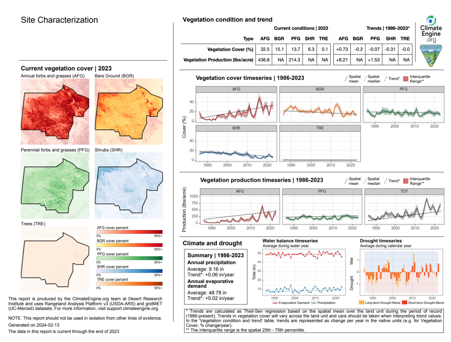 The Site Characterization reports provide a wealth of information on vegetation and climate that can be useful for informing management. Even still, care should be taken when using climate and satellite-based vegetation datasets, as ultimately they are models of complex systems. These reports will be most useful when used alongside additional lines of evidence to inform decisions, such as field-based vegetation, ecological sites, photopoints, local climate stations, and other locally available datasets. Together, these different information sources can help to form a more comprehensive picture of a land unit and its history, providing a firmer footing for informing decisions.