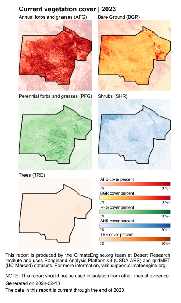 In the left-hand column of the reports you will see maps of ‘Current vegetation cover’ in terms for annual forbs and grasses (AFG), perennial forbs and grasses (PFG), shrubs (SHR), trees (TRE), and bare ground (BGR) for the year of the report, which is 2023 in this case.