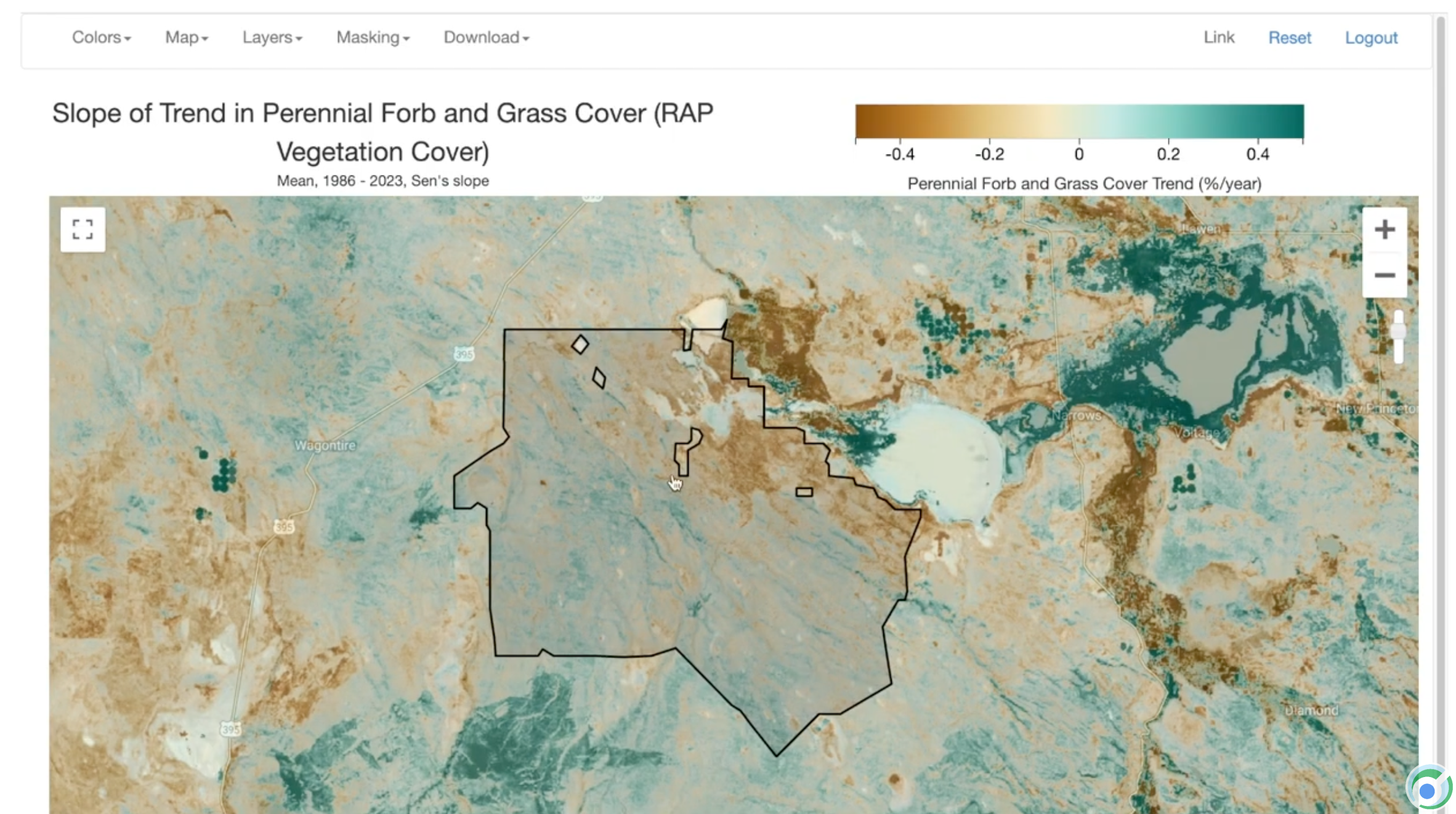 Further investigation can be conducted in the Climate Engine web application at app.climateengine.org, which enables users to produce trend maps using the Rangeland Analysis Platform. These maps can help to account for variability in trends over land units and there is functionality to mask parts of the map that don’t meet a significance threshold. We encourage you to use the Climate Engine app for advanced investigation.