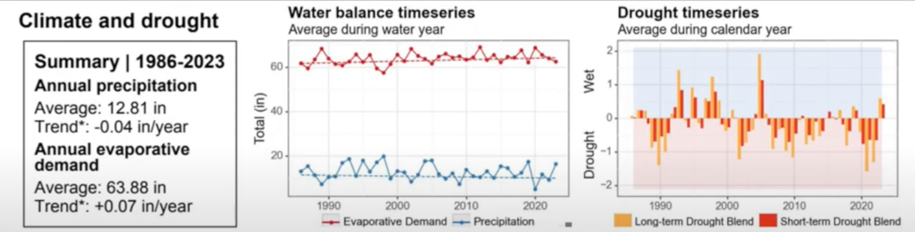 The water balance timeseries figure displays annual summaries of precipitation and evaporative demand for each water year from 1986-2023. The solid lines show the annual data and the dashed lines show the trends, with the slope of the trend in the figure being equal to the trend value displayed in the Summary table.