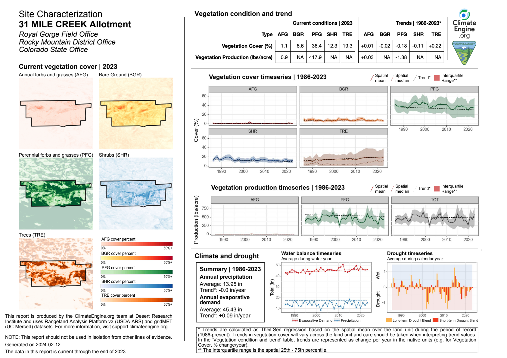To simplify and streamline the availability of satellite-based vegetation data, our team at ClimateEngine.org has partnered with the BLM to provide Site Characterization reports for all BLM state offices, district offices, field offices, and grazing allotments in the conterminous 48 states.