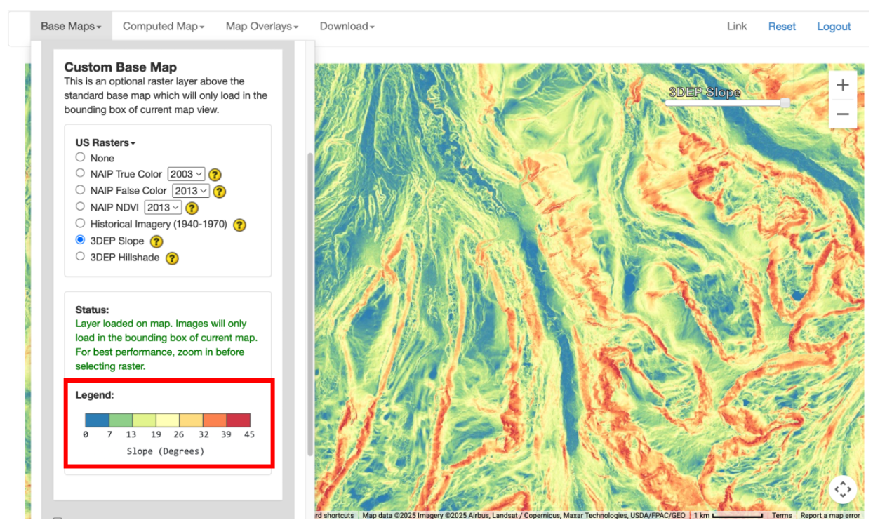 In the Raster section, you will see toggles for the different raster options. The default is set to None. To learn more about each data option, click on the (?) next to the layer. This will direct you to a documentation page. You can only select one option at a time. Then click the circle next to the layer of interest to turn it on. This will add the layer to the map above any base maps or computed maps. The Legend will appear below the Status section. To control the visibility of the custom base map just added, you can adjust the transparency toggle added to the top right of the map.