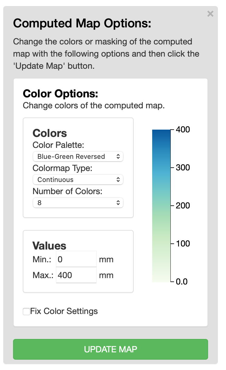 The app allows you to customize your map with modification of the color palette. You can view the options available by clicking on Computed Map located on the selection panel directly above the map. A dropdown will open with Color Options.