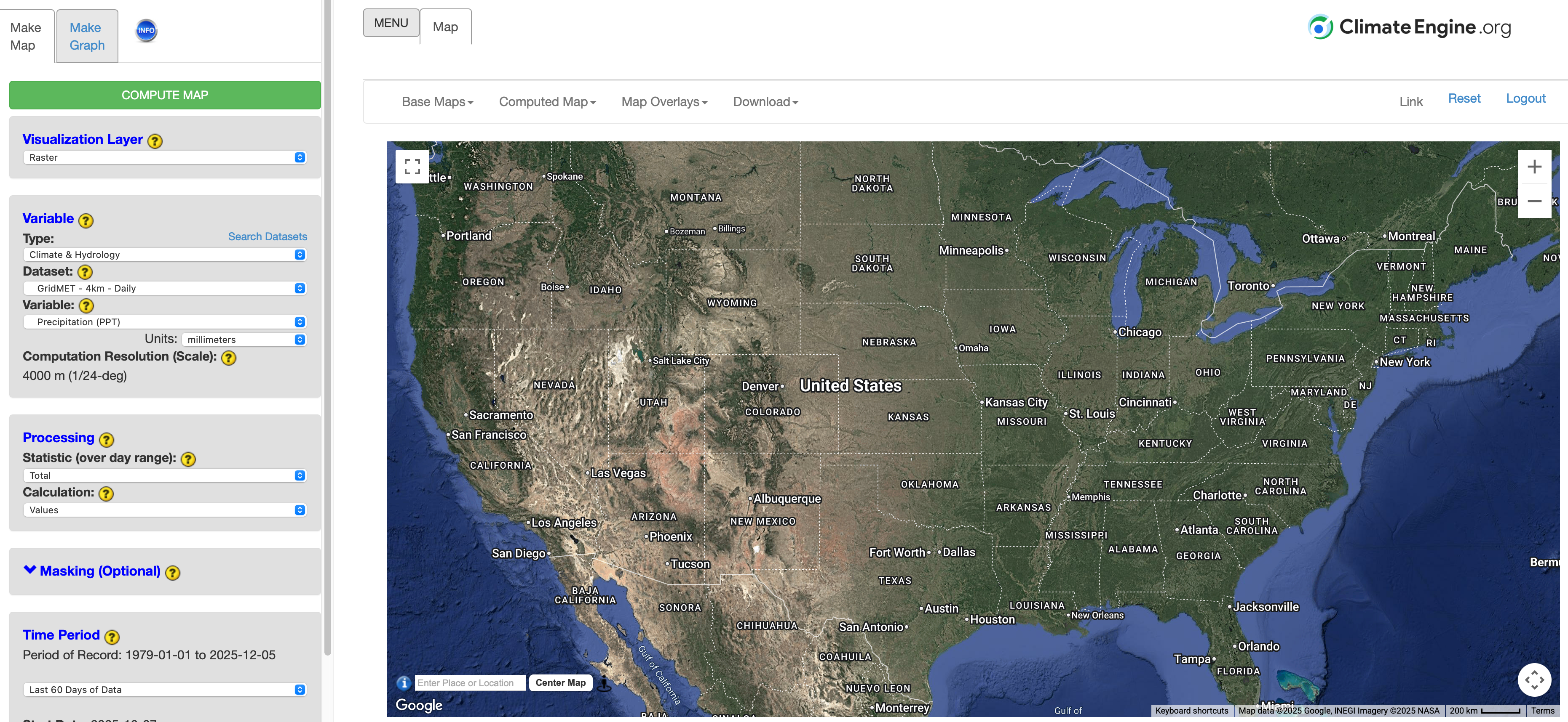 Climate Engine allows you to customize your map with modification of the base map. The default base map is the ‘Hybrid’ background. There are a couple of other standard base maps to choose from. You can modify the standard base map by clicking on the name of the current basemap (i.e. Hybrid) located in the Base Maps drop down in the selection panel at the top of the page. Simply select a new base map and the map will update immediately.