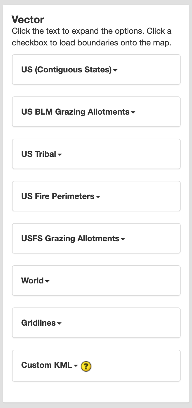 In the **Vector Section, you can check the boxes for various boundaries provided by Climate Engine.
